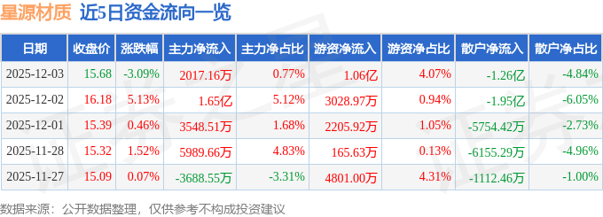 证券之星消息,截至2025年12月3日收盘,星源材质(300568)报收于15.68元,下跌3.09%,换手率13.3%,成交量162.28万手,成交额26.08亿元。