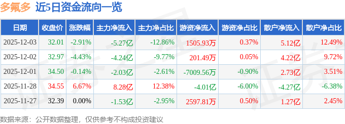 证券之星消息,截至2025年12月3日收盘,多氟多(002407)报收于32.01元,下跌2.91%,换手率11.64%,成交量125.77万手,成交额40.98亿元。