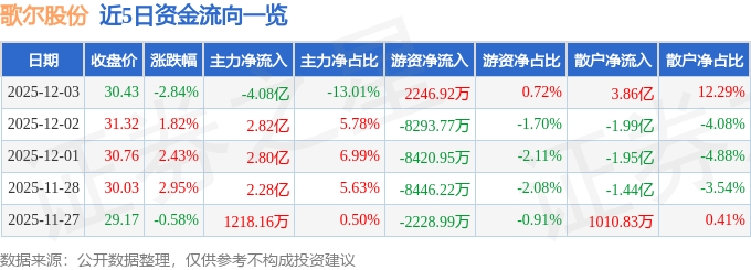 证券之星消息,截至2025年12月3日收盘,歌尔股份(002241)报收于30.43元,下跌2.84%,换手率3.25%,成交量102.15万手,成交额31.38亿元。