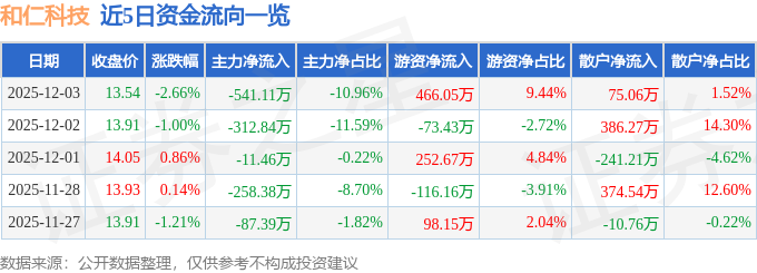 证券之星消息,截至2025年12月3日收盘,和仁科技(300550)报收于13.54元,下跌2.66%,换手率1.39%,成交量3.65万手,成交额4935.77万元。