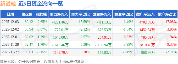 证券之星消息,截至2025年12月3日收盘,新诺威(300765)报收于30.12元,下跌2.65%,换手率0.65%,成交量9.1万手,成交额2.75亿元。