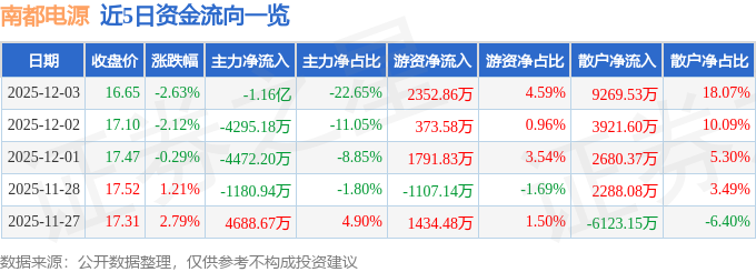 证券之星消息,截至2025年12月3日收盘,南都电源(300068)报收于16.65元,下跌2.63%,换手率3.57%,成交量30.48万手,成交额5.13亿元。