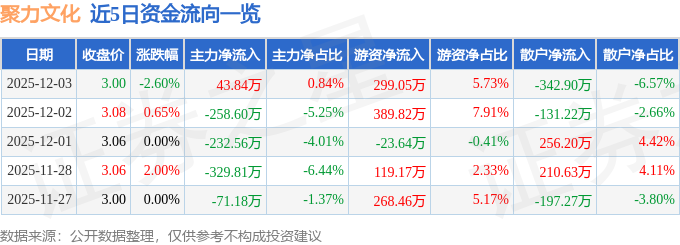 证券之星消息,截至2025年12月3日收盘,聚力文化(002247)报收于3.0元,下跌2.6%,换手率2.68%,成交量17.24万手,成交额5218.84万元。