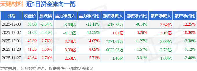 证券之星消息,截至2025年12月3日收盘,天赐材料(002709)报收于39.98元,下跌2.54%,换手率5.02%,成交量73.94万手,成交额29.74亿元。