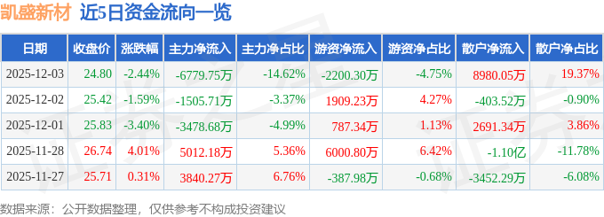 证券之星消息,截至2025年12月3日收盘,凯盛新材(301069)报收于24.8元,下跌2.44%,换手率4.72%,成交量18.45万手,成交额4.64亿元。