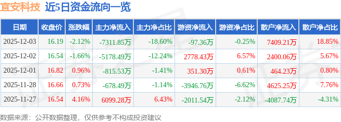 12月3日的资金流向数据方面,主力资金净流出7311.85万元,占总成交额18.6%,游资资金净流出97.36万元,占总成交额0.25%,散户资金净流入7409.21万元,占总成交额18.85%。