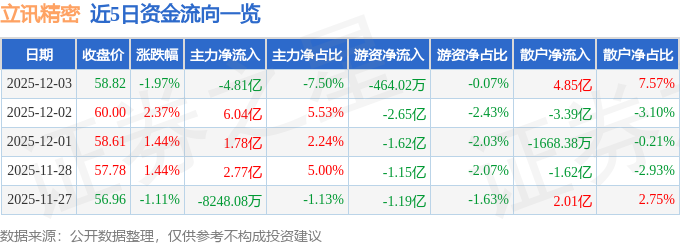 证券之星消息,截至2025年12月3日收盘,立讯精密(002475)报收于58.82元,下跌1.97%,换手率1.49%,成交量108.09万手,成交额64.09亿元。