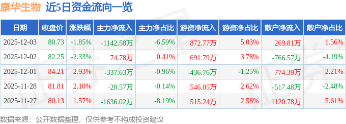 证券之星消息,截至2025年12月3日收盘,康华生物(300841)报收于80.73元,下跌1.85%,换手率1.8%,成交量2.14万手,成交额1.73亿元。