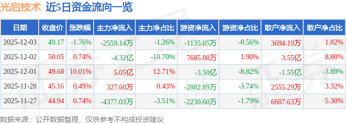 证券之星消息,截至2025年12月3日收盘,光启技术(002625)报收于49.17元,下跌1.76%,换手率1.89%,成交量40.8万手,成交额20.29亿元。