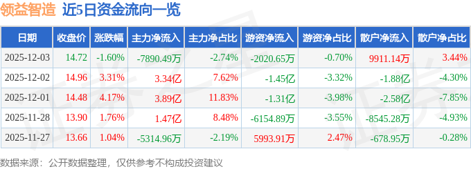 证券之星消息,截至2025年12月3日收盘,领益智造(002600)报收于14.72元,下跌1.6%,换手率2.7%,成交量194.44万手,成交额28.78亿元。