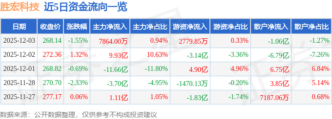 证券之星消息,截至2025年12月3日收盘,胜宏科技(300476)报收于268.14元,下跌1.55%,换手率3.58%,成交量30.65万手,成交额83.62亿元。