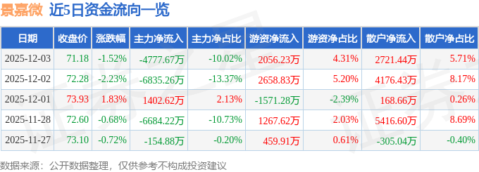 证券之星消息,截至2025年12月3日收盘,景嘉微(300474)报收于71.18元,下跌1.52%,换手率1.64%,成交量6.68万手,成交额4.77亿元。