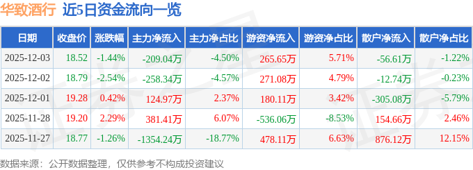 证券之星消息,截至2025年12月3日收盘,华致酒行(300755)报收于18.52元,下跌1.44%,换手率0.6%,成交量2.51万手,成交额4648.94万元。