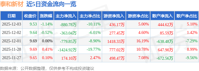 证券之星消息,截至2025年12月3日收盘,泰和新材(002254)报收于9.53元,下跌1.14%,换手率1.11%,成交量9.12万手,成交额8715.39万元。