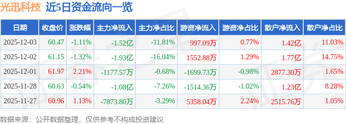 证券之星消息,截至2025年12月3日收盘,光迅科技(002281)报收于60.47元,下跌1.11%,换手率2.71%,成交量21.09万手,成交额12.87亿元。