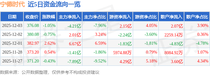 证券之星消息,截至2025年12月3日收盘,宁德时代(300750)报收于376.08元,下跌1.05%,换手率0.33%,成交量13.99万手,成交额52.95亿元。