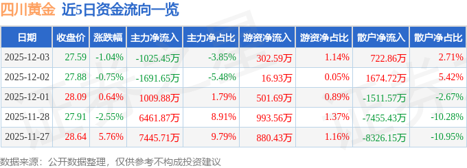 证券之星消息,截至2025年12月3日收盘,四川黄金(001337)报收于27.59元,下跌1.04%,换手率3.33%,成交量9.61万手,成交额2.67亿元。