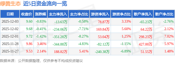 证券之星消息,截至2025年12月3日收盘,绿茵生态(002887)报收于9.6元,下跌0.83%,换手率1.26%,成交量2.46万手,成交额2364.91万元。