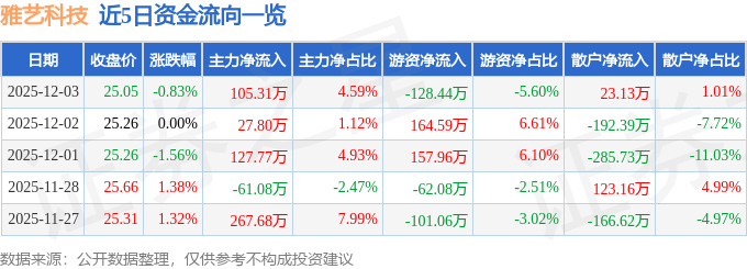 证券之星消息,截至2025年12月3日收盘,雅艺科技(301113)报收于25.05元,下跌0.83%,换手率1.65%,成交量9109.0手,成交额2291.99万元。