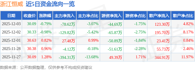 证券之星消息,截至2025年12月3日收盘,浙江恒威(301222)报收于30.09元,下跌0.79%,换手率1.06%,成交量8494.0手,成交额2559.49万元。