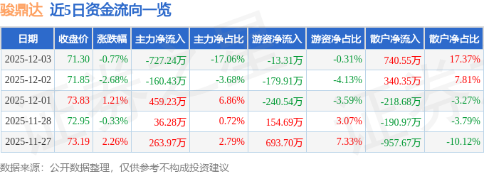 证券之星消息,截至2025年12月3日收盘,骏鼎达(301538)报收于71.3元,下跌0.77%,换手率1.91%,成交量5952.0手,成交额4262.69万元。