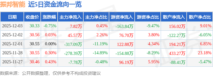 证券之星消息,截至2025年12月3日收盘,振邦智能(003028)报收于30.33元,下跌0.75%,换手率0.81%,成交量5707.0手,成交额1730.73万元。