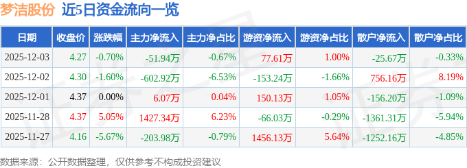 证券之星消息,截至2025年12月3日收盘,梦洁股份(002397)报收于4.27元,下跌0.7%,换手率2.78%,成交量18.01万手,成交额7727.0万元。