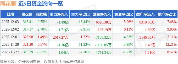 证券之星消息,截至2025年12月3日收盘,同花顺(300033)报收于315.41元,下跌0.55%,换手率1.27%,成交量3.51万手,成交额11.11亿元。