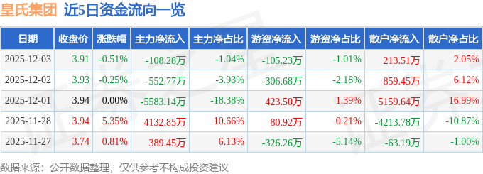 证券之星消息,截至2025年12月3日收盘,皇氏集团(002329)报收于3.91元,下跌0.51%,换手率4.1%,成交量26.64万手,成交额1.04亿元。