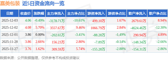 证券之星消息,截至2025年12月3日收盘,嘉美包装(002969)报收于4.06元,下跌0.49%,换手率7.79%,成交量73.99万手,成交额3.0亿元。