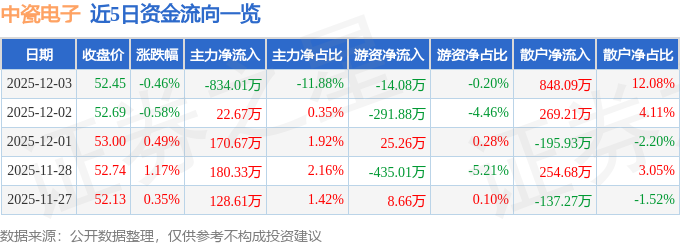 证券之星消息,截至2025年12月3日收盘,中瓷电子(003031)报收于52.45元,下跌0.46%,换手率0.39%,成交量1.34万手,成交额7018.43万元。