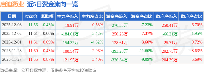 证券之星消息,截至2025年12月3日收盘,启迪药业(000590)报收于11.56元,下跌0.43%,换手率1.35%,成交量3.23万手,成交额3736.84万元。