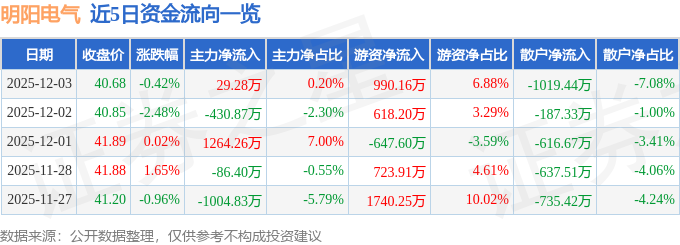 证券之星消息,截至2025年12月3日收盘,明阳电气(301291)报收于40.68元,下跌0.42%,换手率2.19%,成交量3.54万手,成交额1.44亿元。