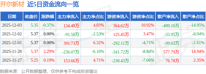 12月3日的资金流向数据方面,主力资金净流入134.48万元,占总成交额4.03%,游资资金净流入364.62万元,占总成交额10.92%,散户资金净流出499.1万元,占总成交额14.95%。