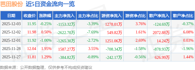 证券之星消息,截至2025年12月3日收盘,芭田股份(002170)报收于11.95元,下跌0.25%,换手率3.61%,成交量28.34万手,成交额3.4亿元。