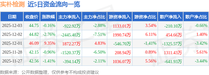 证券之星消息,截至2025年12月3日收盘,实朴检测(301228)报收于44.75元,下跌0.16%,换手率5.91%,成交量7.08万手,成交额3.2亿元。