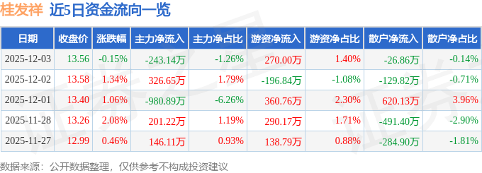 证券之星消息,截至2025年12月3日收盘,桂发祥(002820)报收于13.56元,下跌0.15%,换手率7.13%,成交量14.33万手,成交额1.94亿元。