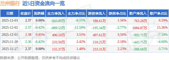 证券之星消息,截至2025年12月3日收盘,兰州银行(001227)报收于2.37元,上涨0.0%,换手率1.15%,成交量48.64万手,成交额1.16亿元。