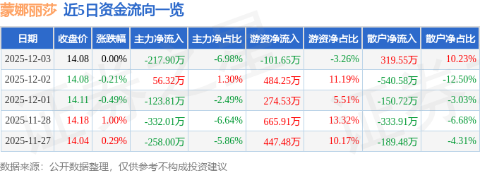 12月3日的资金流向数据方面,主力资金净流出217.9万元,占总成交额6.98%,游资资金净流出101.65万元,占总成交额3.26%,散户资金净流入319.55万元,占总成交额10.23%。