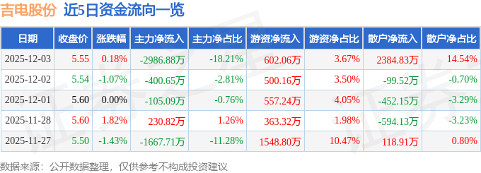 证券之星消息,截至2025年12月3日收盘,吉电股份(000875)报收于5.55元,上涨0.18%,换手率0.88%,成交量29.56万手,成交额1.64亿元。