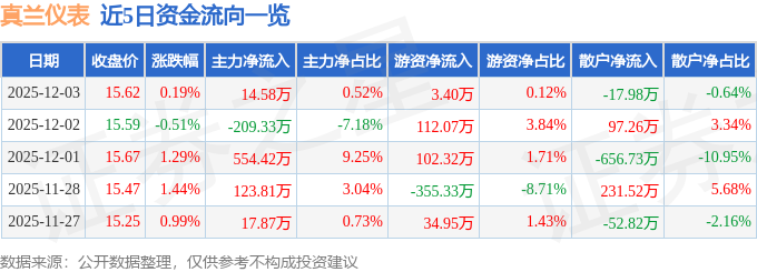 证券之星消息,截至2025年12月3日收盘,真兰仪表(301303)报收于15.62元,上涨0.19%,换手率1.77%,成交量1.8万手,成交额2800.38万元。