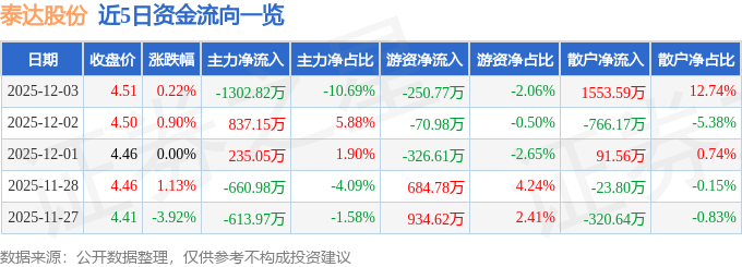 证券之星消息,截至2025年12月3日收盘,泰达股份(000652)报收于4.51元,上涨0.22%,换手率1.85%,成交量27.22万手,成交额1.22亿元。