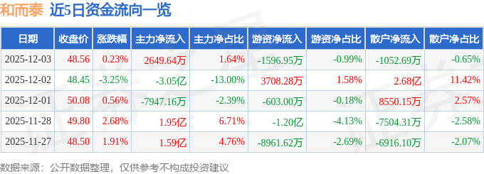 证券之星消息,截至2025年12月3日收盘,和而泰(002402)报收于48.56元,上涨0.23%,换手率4.14%,成交量33.36万手,成交额16.17亿元。