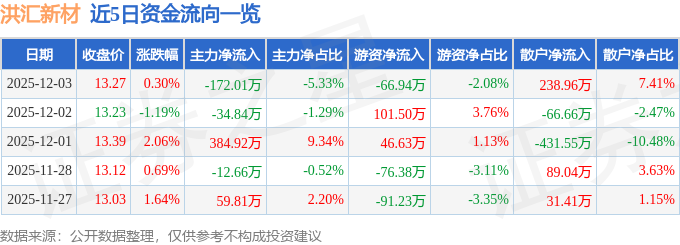 证券之星消息,截至2025年12月3日收盘,洪汇新材(002802)报收于13.27元,上涨0.3%,换手率1.34%,成交量2.44万手,成交额3226.14万元。