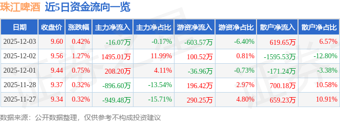 证券之星消息,截至2025年12月3日收盘,珠江啤酒(002461)报收于9.6元,上涨0.42%,换手率0.45%,成交量9.85万手,成交额9425.83万元。