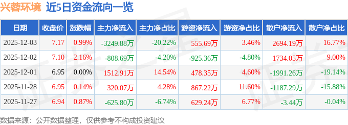 证券之星消息,截至2025年12月3日收盘,兴蓉环境(000598)报收于7.17元,上涨0.99%,换手率0.75%,成交量22.45万手,成交额1.61亿元。