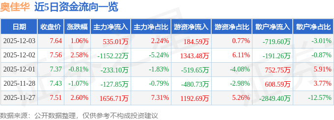 证券之星消息,截至2025年12月3日收盘,奥佳华(002614)报收于7.64元,上涨1.06%,换手率7.11%,成交量31.37万手,成交额2.39亿元。