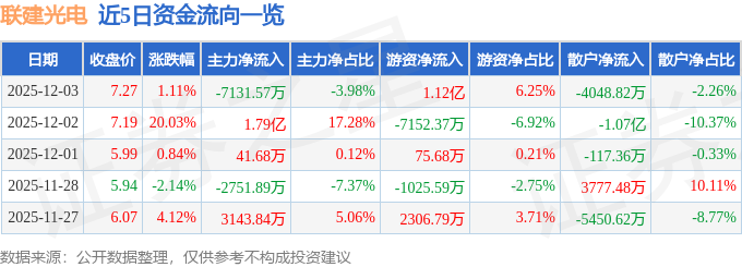 证券之星消息,截至2025年12月3日收盘,联建光电(300269)报收于7.27元,上涨1.11%,换手率45.55%,成交量239.42万手,成交额17.9亿元。