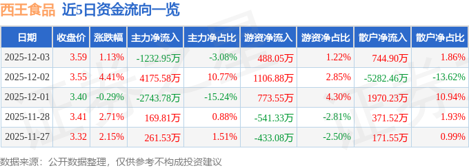 证券之星消息,截至2025年12月3日收盘,西王食品(000639)报收于3.59元,上涨1.13%,换手率10.38%,成交量112.05万手,成交额4.0亿元。