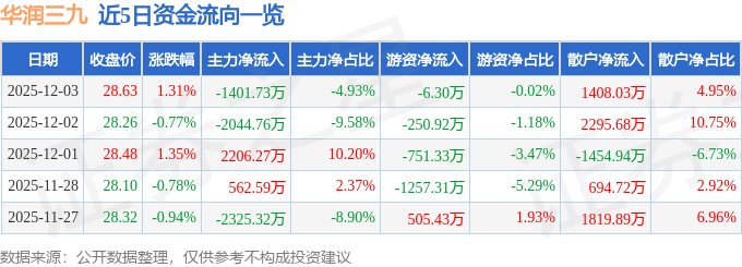 证券之星消息,截至2025年12月3日收盘,华润三九(000999)报收于28.63元,上涨1.31%,换手率0.6%,成交量9.97万手,成交额2.84亿元。
